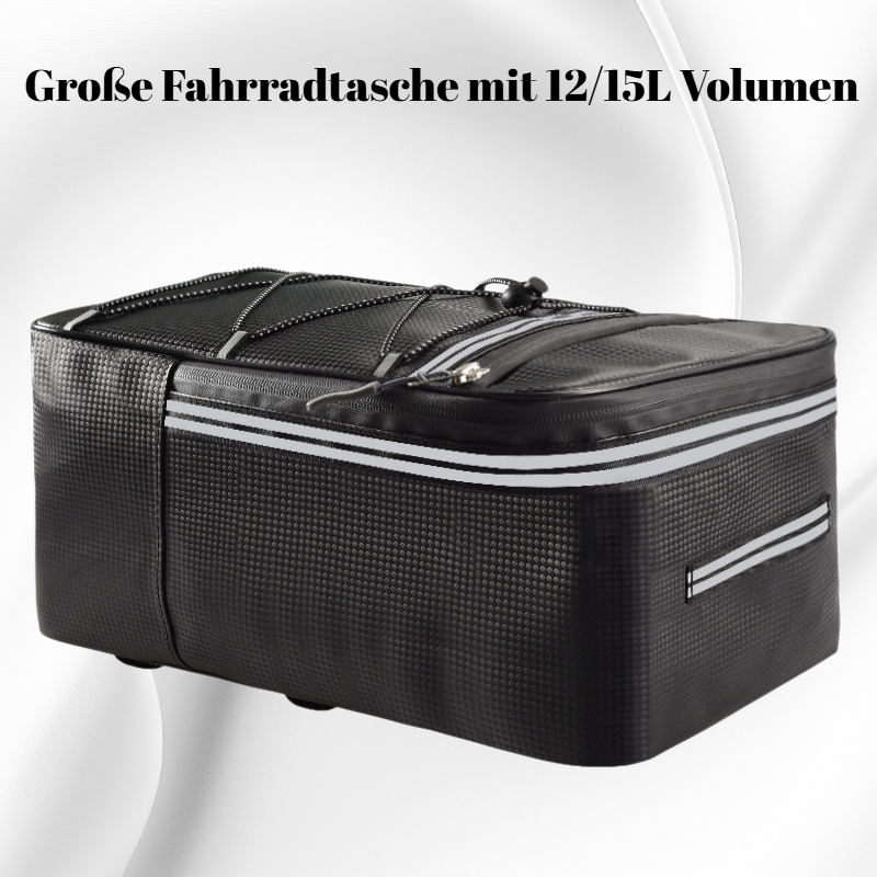 Große Fahrradtasche mit 12/15L Volumen, passend für Gepäckträger. Multifunktionale Aufbewahrung, wasserabweisend, robustes Material, einfache Befestigung und vielseitig einsetzbar für Alltag und Touren.